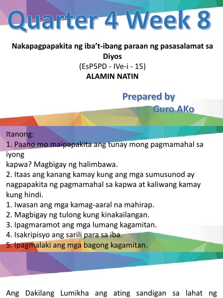 Link if online pagpapakita ng pasasalamat Nasusuri ang mga halimbawa o sitwasyon from COTED 101 238 at University of Antique Tibiao Antique. Kasuotan at mga gamit 7. Makiisa sa pagsasaayos ng mga kahinaan ng.