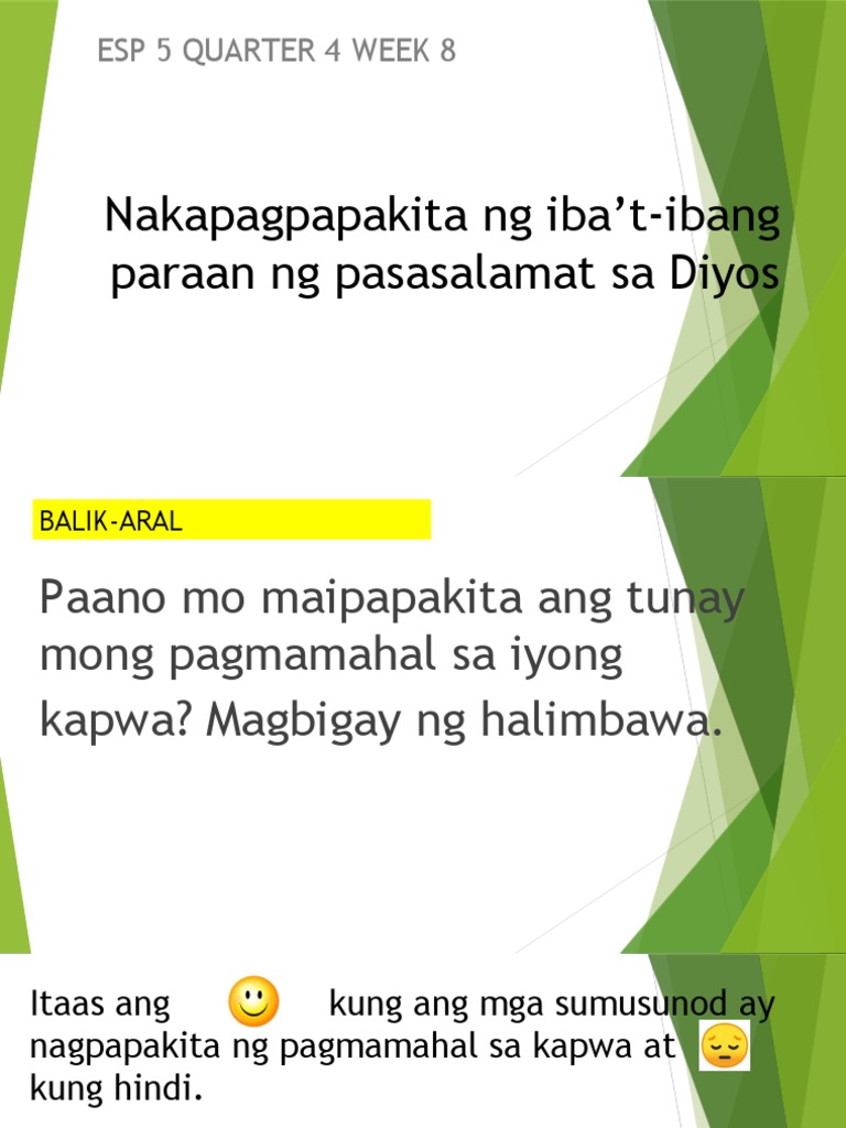 Paggawa ng Mabuti Sa Kapwa By. Alin sa sumusunod ang tamang paraan ng pagpapakita ng pagmamahal sa bayan. Narito ang mga halimbawa ng pagpapakita ng pasasalamat.