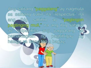 Ang birtud ng _____ ay ang pagpapakita ng halaga sa taong nakapaligid sa atin. Pagtulog at paggawa ng mabuti ay palaging gawin. Naipakikita mo ang paggalang kung naiingatan mo ang mga bagay na iyong ginamit at hiniram.