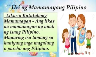 Ang Mamamayang Pilipino Ayon sa Artikulo IV Seksiyon 1 ng Saligang Batas ng 1987 maituturing na mamamayang Pilipino ang sumusunod. Paggamit ng sariling wika sa kabila ng ibat ibang wikang ipinakilala sa bansa. Pagmamalaki sa lahing Pilipino sa loob at labas man ng bansa.