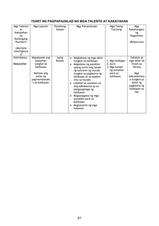 D Rubric para sa Tsart ng Pagpapaunlad ng mga Talento at Kakayahan Kraytirya 5 4 3 2 1 May nabuong tiyak na hakbang sa pagpapaun lad ng mga talento at kakayahan Natukoy ang talento at kakayahanan na pauunlarin ngunit walang naitalang hakbang Nakapagtala ng hakbang sa lahat ng mga talino na nakakuha ng mababang marka Natukoy ang talento at. Ang tugtog ay magmumula sa mga Kagawaran ng Filipino. Napakagaling ng interpretasyon o kilos batay sa awit o pyesang iniinterpret.